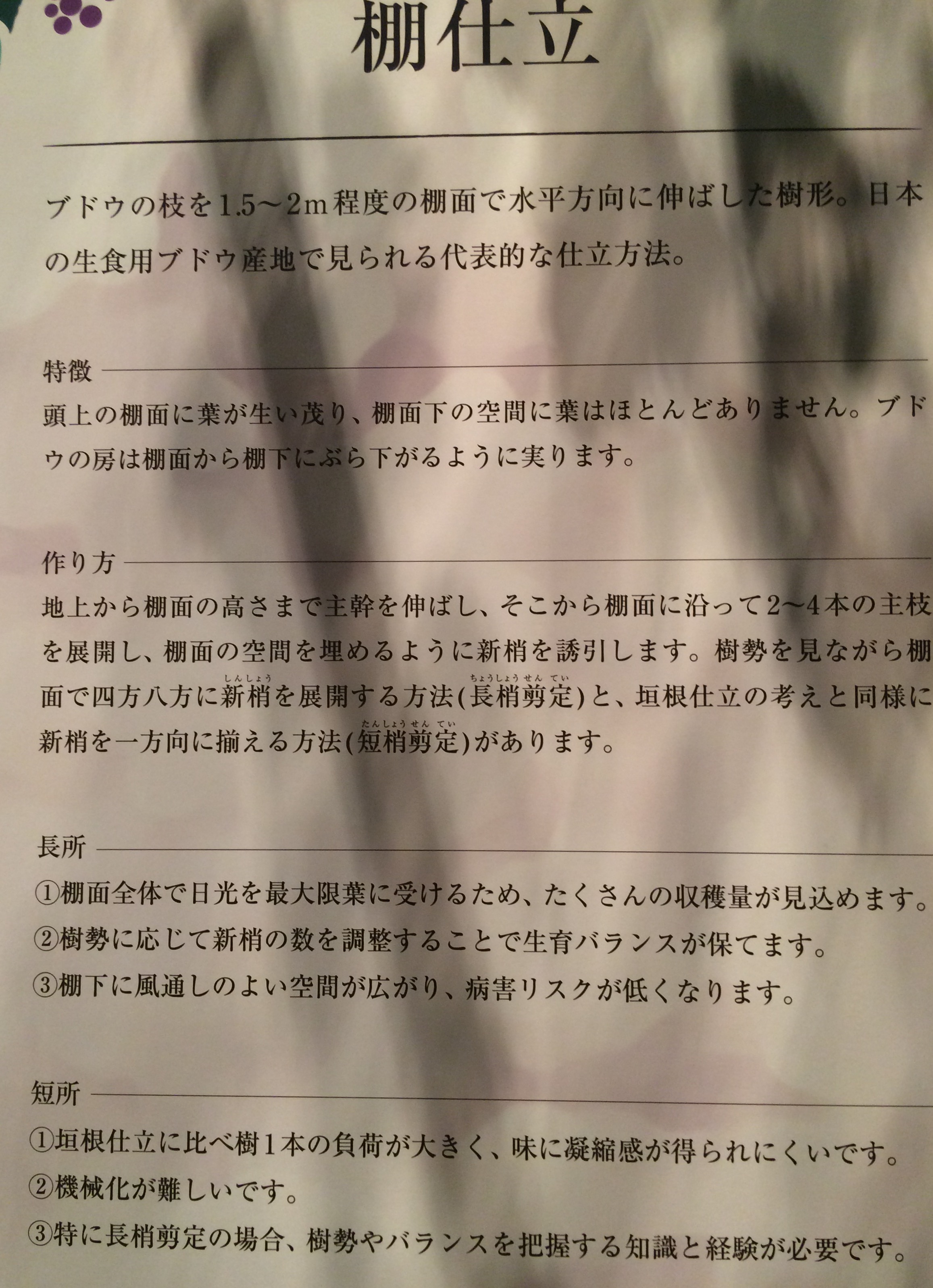 棚仕立だと棚の上には良く陽が当たり下には風が良く抜けて病害の心配が少なくて収量を多く期待できますが、一株あたりの実の数が多い代わりに凝集感が少なく、ワインを作るための良質なぶどうを作りにくい上に機械化が難しいそうです。